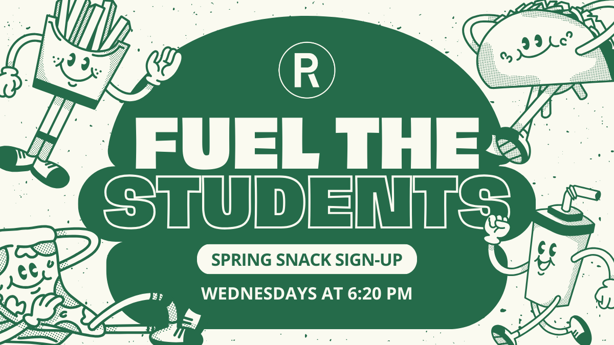 Help us feed our students this spring! Our Wednesday night Fruit of the Spirit study will draw about 15 hungry teens each week, and we’d love your help providing snacks and drinks. Sign up here to bring anything from chips or cookies to pizza or tacos (Dr. Pepper is always a hit!). Thank you for blessing our students with food and hospitality!
